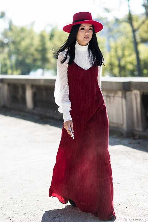 | Đầm dây maxi màu đỏ thướt tha được cô nàng phối với áo xuyên thấu trắng cùng mũ fedora cùng tông rất duyên dáng và dịu dàng. |