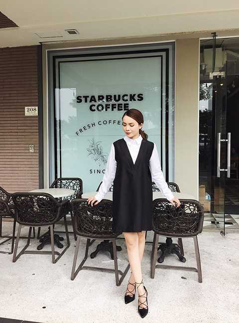 | Áo sơ-mi là một trong trang phục mọi người nghĩ ngay đến khi định kết hợp với đầm sát nách. Với set đồ này, Yến Trang trông như một tiểu thư đài các, đoan trang. |