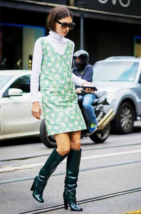 | Đầm hoa xanh nhạt "sánh đôi" với áo trắng cổ lọ và giày bốt cao cổ vừa ấm áp vừa rất sành điệu. |