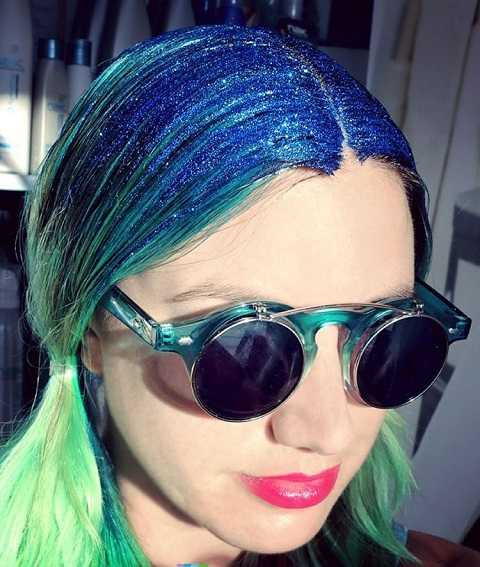 | Với mái tóc xanh lá, dùng kim tuyến xanh dương tạo phong cách ombre cá tính rất bắt mắt. |