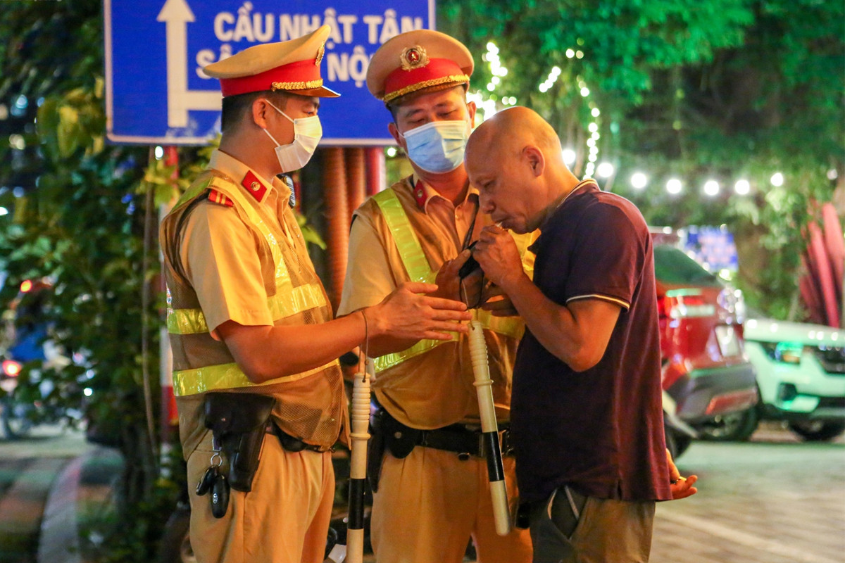 Đội CSGT số 2, Phòng CSGT TP Hà Nội kiểm tra nồng độ cồn trên đường Lạc Long Quân (phường Xuân La, quận Tây Hồ, Hà Nội). (Ảnh: Khổng Chí).
