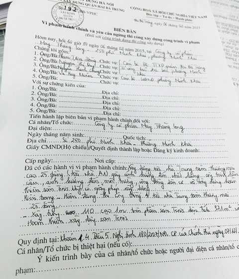 Một điểm đáng chú ý khác là trong biên bản vi phạm hành chính và yêu cầu ngừng thi công xây dựng công trình vi phạm do bà Đăng ký thì chỉ có duy nhất chữ ký của bà Đăng, còn phần tổ chức cá nhân vi phạm, đại diện nhà thầu, đại diện chính quyền phường, xã và người chứng kiến đều bị bỏ trống.