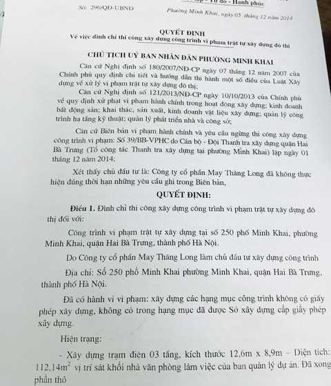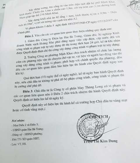 Cụ thể, trong Quyết định của UBND Phường Minh Khai đã nêu rất rõ: "Giám đốc Công ty Điện lực Hai Bà Trưng, Giám đốc Xí nghiệp Kinh doanh Nước sạch Hoàng Mai phải dừng ngay việc cấp điện, cấp nước đối với công trình vi phạm trật tự xây dựng đô thị trong thời hạn 24 giờ, kể từ khi nhận được Quyết định đình chỉ thi công xây dựng công trình vi phạm trật tự xây dựng.
