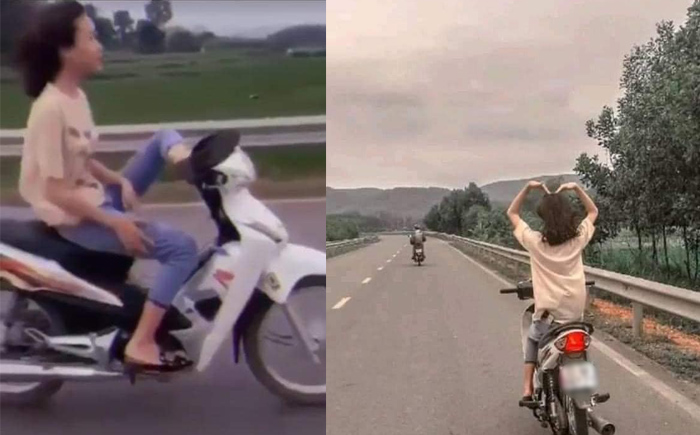 Trên đường đi, nữ sinh H. "thể hiện" mình bằng cách lái xe bằng chân, đưa tay hai tay lên "thả tim" để hai người chị đi sau chụp lại.