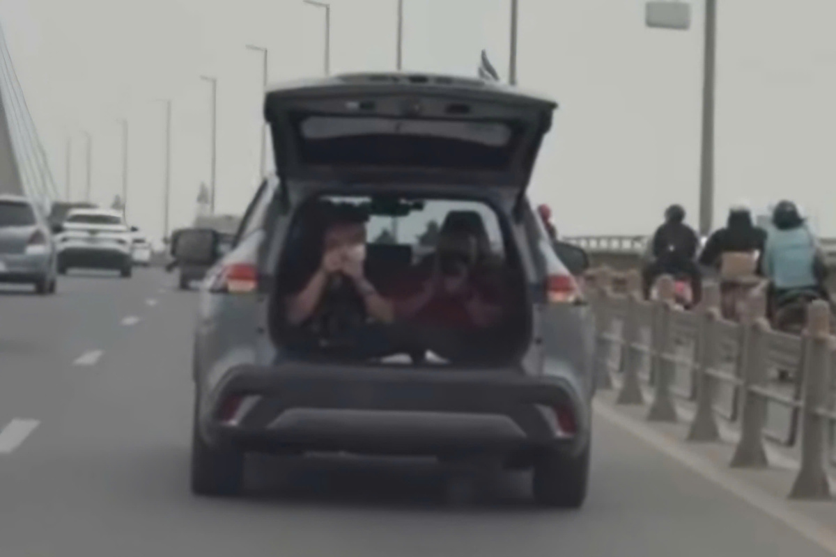 Hình ảnh hai người ngồi trong khoang hành lý phía sau chiếc ô tô mở cốp khi xe đang lưu thông trên cầu Nhật Tân, tiềm ẩn nguy cơ mất an toàn giao thông.