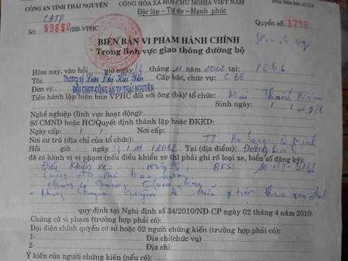 Biên bản do Thượng sĩ Lưu Thị Hải Yến, Đội Cảnh sát giao thông (CSGT) Công an TP Thái Nguyên (tỉnh Thái Nguyên) lập ngày 13-11 ghi rõ: anh Mai Thành Nam (SN 1988, ngụ tại TP Hạ Long, tỉnh Quảng Ninh) điều khiển xe máy BKS 14H8-0168 đã vi phạm 3 lỗi: không đội mũ bảo hiểm (mức phạt trong Nghị định 71 là 100-200 nghìn đồng - PV), không có gương chiếu hậu (300-500 nghìn đồng - PV) và chưa làm thủ tục chuyển quyền sở hữu phương tiện (800.000-1.200.000 đồng - PV) theo quy định.