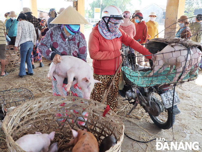 Chúng tôi tình cờ gặp anh Trần Văn Bé, người rao bán heo con đang nghỉ chân ở ngã ba đường liên thôn Phong Nam - Quang Châu (xã Hòa Châu, huyện Hòa Vang). Vừa cột lại hai chiếc giỏ đầy nhóc heo con treo hai bên sườn xe, anh tâm sự: “Heo ni tui lấy ở chợ heo Bà Rén chở đi bán dạo. Mọi khi có người gọi điện thoại đặt mới chở heo ra. Chừ chợ ế quá, phải đem heo tới tận tay người nuôi mới may ra bán được hàng”.