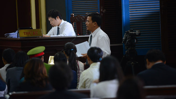 Luật sư Lưu Văn Tám (bảo vệ quyền và lợi ích hợp pháp của Ngân hàng Á Châu - ACB) phát biểu tranh luận tại tòa