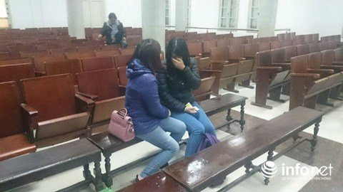 Hai nữ bị cáo Đinh Thị Hồng Vinh và Đoàn Thị Luyến ôm nhau khóc nức nở sau khi Tòa tạm nghỉ phiên xét xử sáng 13/12.