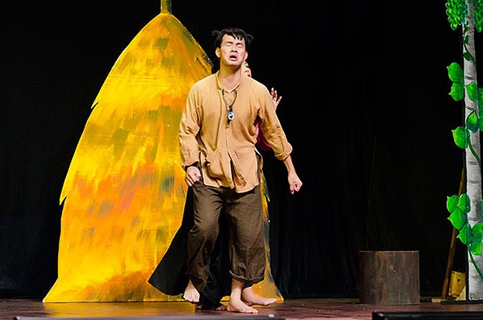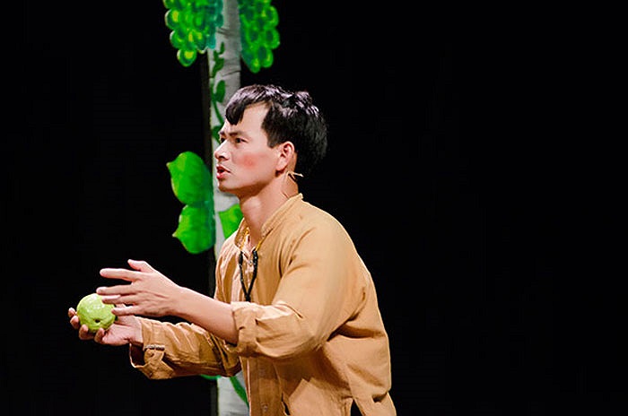Tự Long trong vở diễn, dù bị bong gân chân do đá bóng nhưng anh vẫn diễn rất say sưa.