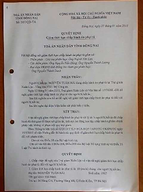 Hải “Bánh” hớn hở khoe: “sáng nay tôi mới nhận quyết định giảm án. Cách đây không lâu, tôi được giảm án từ chung thân xuống án tù có thời hạn 30 năm. Sáng nay nhận thêm quyết định giảm án 10 tháng tù nữa”.