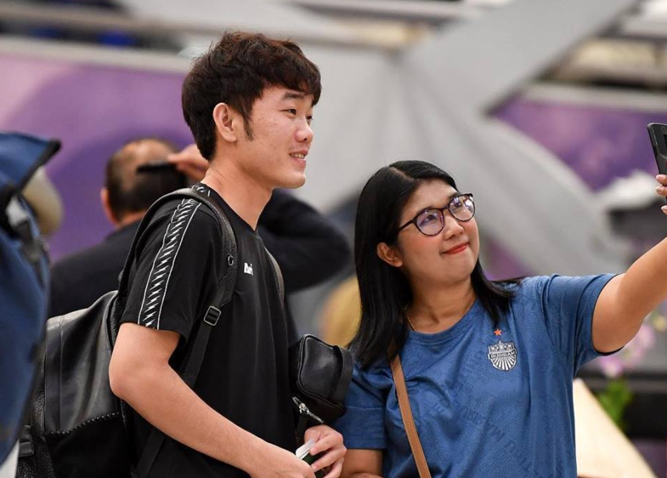 Tại sân bay quốc tế Suvarnabhumi, Xuân Trường chụp ảnh lưu niệm cùng fan của Burirram Untied.