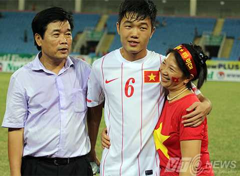 | Xuân Trường rạng rỡ trong vòng tay cha mẹ (Ảnh: Nhạc Dương) |