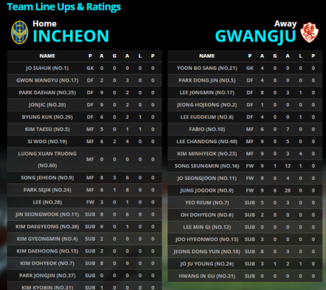 | Danh sách cầu thủ ra sân của 2 Incheon Utd và Gwanju FC |