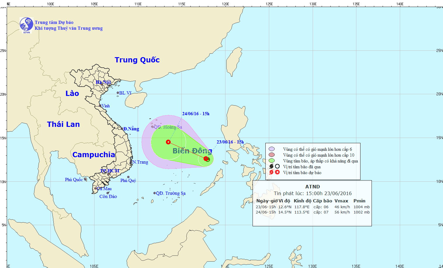 Đến 13h ngày 24/6, vị trí tâm áp thấp nhiệt đới ở vào khoảng 14,5 độ Vĩ Bắc; 113,5 độ Kinh Đông, cách quần đảo Hoàng Sa khoảng 270km về phía Đông Nam. Sức gió mạnh nhất ở vùng gần tâm áp thấp nhiệt đới mạnh cấp 6-7 (40-60km/giờ), giật cấp 8-9.