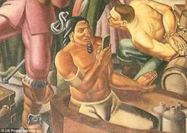 Cụ thể, trong bức tranh Mr. Pynchon and the Settling of Springfield của họa sĩ Umberto Romano vẽ năm 1937, một người thổ dân da đỏ sống ở thế kỷ 17 đang cầm một vật thể nhỏ hình chữ nhật, trông không khác là bao với chiếc Iphone hiện nay. Điều đặc biệt là cách người này nhìn chằm chằm vào vật thế và vị trí của ngón tay giống hệt như cách mà con người thời hiện đại cầm và vuốt màn hình của smartphone.