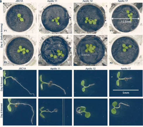 Két quả cho thấy cả 4 chậu đều nảy mầm tốt. Có 3 chậu phát triển cực tốt là JCS-1A, Apollo 12, Apollo17. Chậu Apollo 11 phát triển hơi chậm và bị héo vào ngày thứ 16.