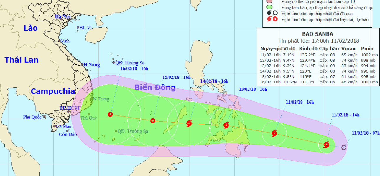 Theo Trung tâm Dự báo Khí tượng Thủy văn Trung ương, hồi 16h ngày 11/2, vị trí tâm bão Sanba ở vào khoảng 7,1 độ Vĩ Bắc; 135,2 độ Kinh Đông, cách bờ biển miền Nam Philippines khoảng 1000km về phía Đông.