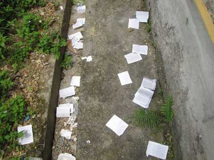 Tại Hội đồng thi trường THPT Xuân Hòa (Phúc Yên, Vĩnh Phúc) sau giờ thi môn Văn, ngay ngoài đường lớn dẫn vào cổng trường , tài liệu, phao thi được vứt bừa bãi, la liệt. Chưa hết, dọc con đường học sinh ra về, phao thi thỉnh thoảng cũng được phi tang vào bụi cây, lề đường, thùng rác.