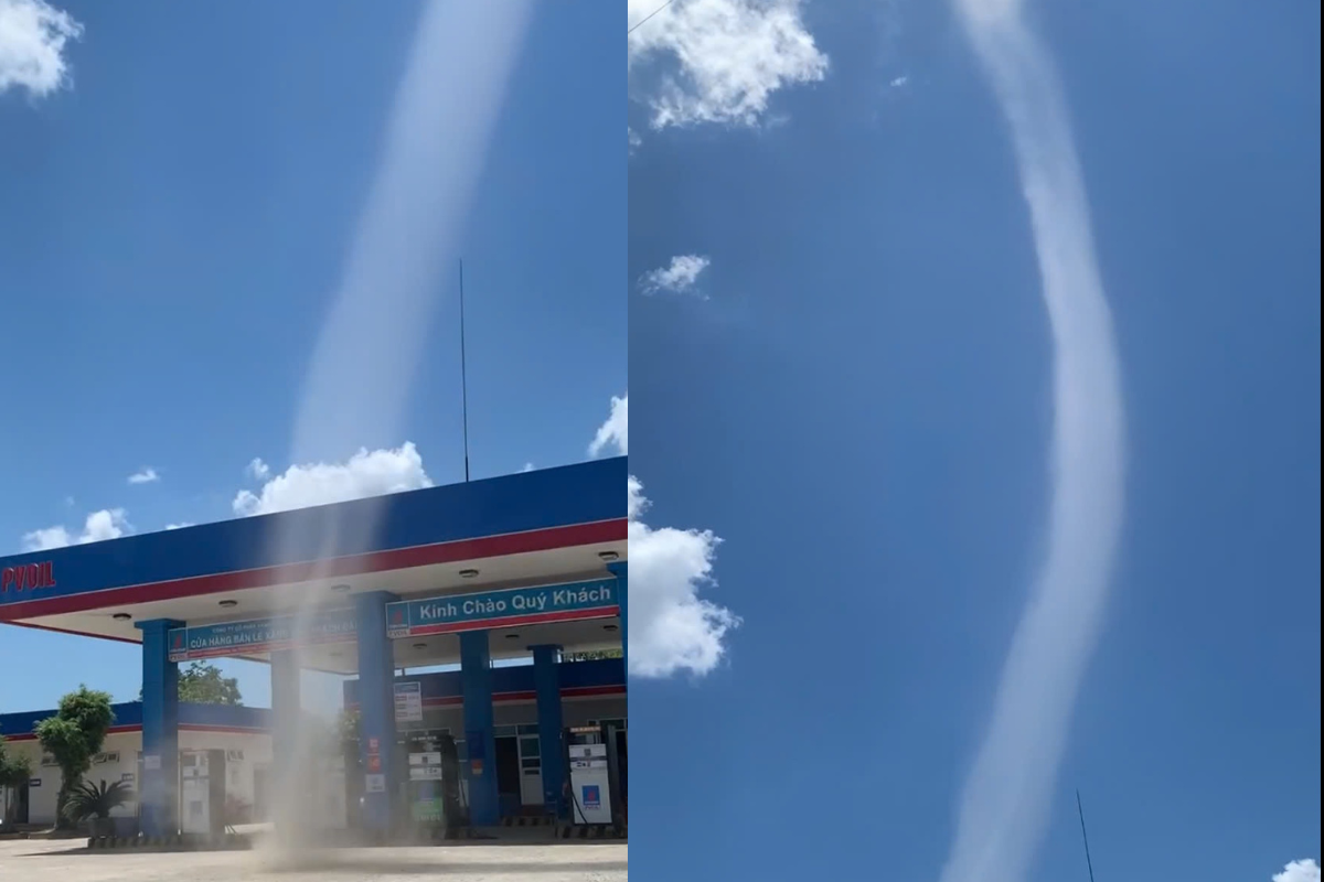 Cơn lốc xoáy cao khoảng 50m xuất hiện gần một cửa hàng xăng dầu. (Ảnh cắt từ clip)
