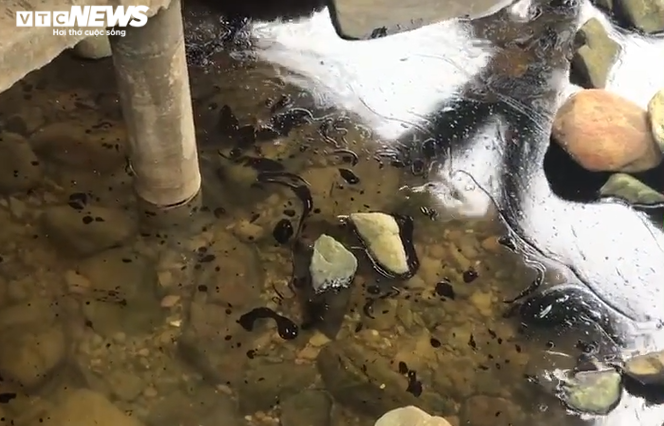 Có những nơi vết dầu rất đặc, bám quanh chân cột bè nổi. Ngay khi phát hiện sự việc, người dân đã báo cáo lực lượng chức năng.