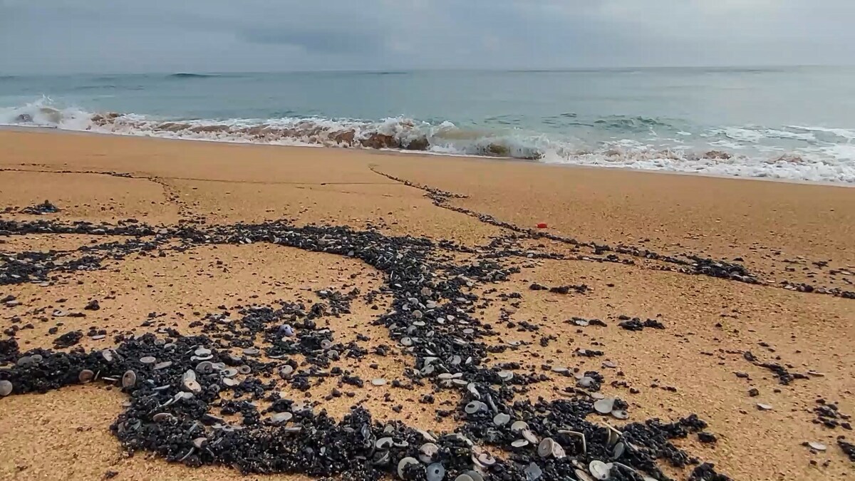 Tại bờ biển, theo quan sát của phóng viên, trong vệt dầu có lẫn nhiều miếng mỏng hình tròn như đồng xu dày khoảng 2mm, đường kính từ 1cm đến 1,5cm và chưa từng xuất hiện ở vùng biển này.