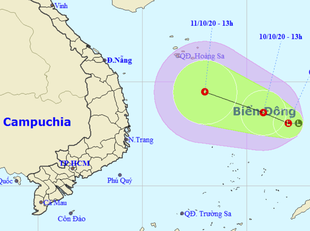 Theo Trung tâm Dự báo KTTV quốc gia, hồi 13h ngày 9/10, vị trí trung tâm vùng áp thấp ở cách đảo Song Tử Tây khoảng 360km về phía Đông Bắc.