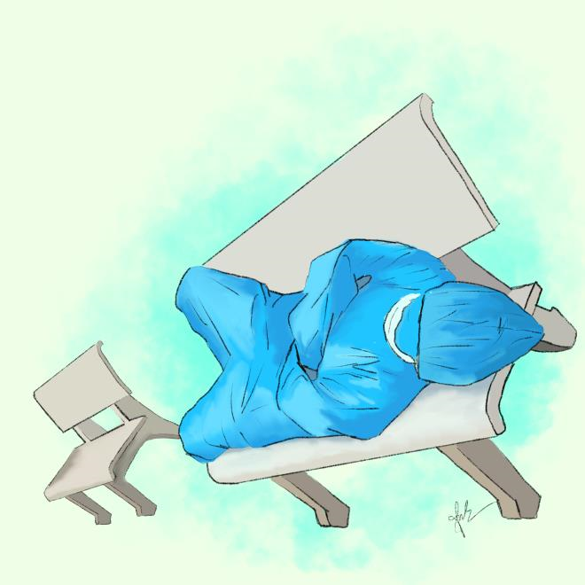 Các y bác sĩ tranh thủ chợp mắt qua nét vẽ của nữ sinh viên Minh Anh.