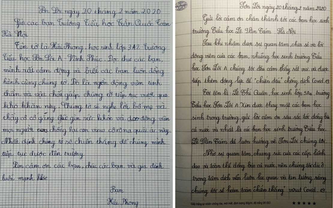 Những bức thư với lời lẽ hồn nhiên và sự quan tâm chân thành của các bạn học sinh như Bảo Thy của trường Tiểu học Lê Văn Tám (quận Hai Bà Trưng, Hà Nội) và bạn Hiền Giang trường Tiểu học Trần Quốc Toản (quận Hoàn Kiếm, Hà Nội) được đăng tải đã chạm tới trái tim của tất cả mọi người, đặc biệt là các bạn học sinh ở xã Sơn Lôi, huyện Bình Xuyên, tỉnh Vĩnh Phúc - nơi đang được cách ly để đảm bảo phòng dịch Covid-19.