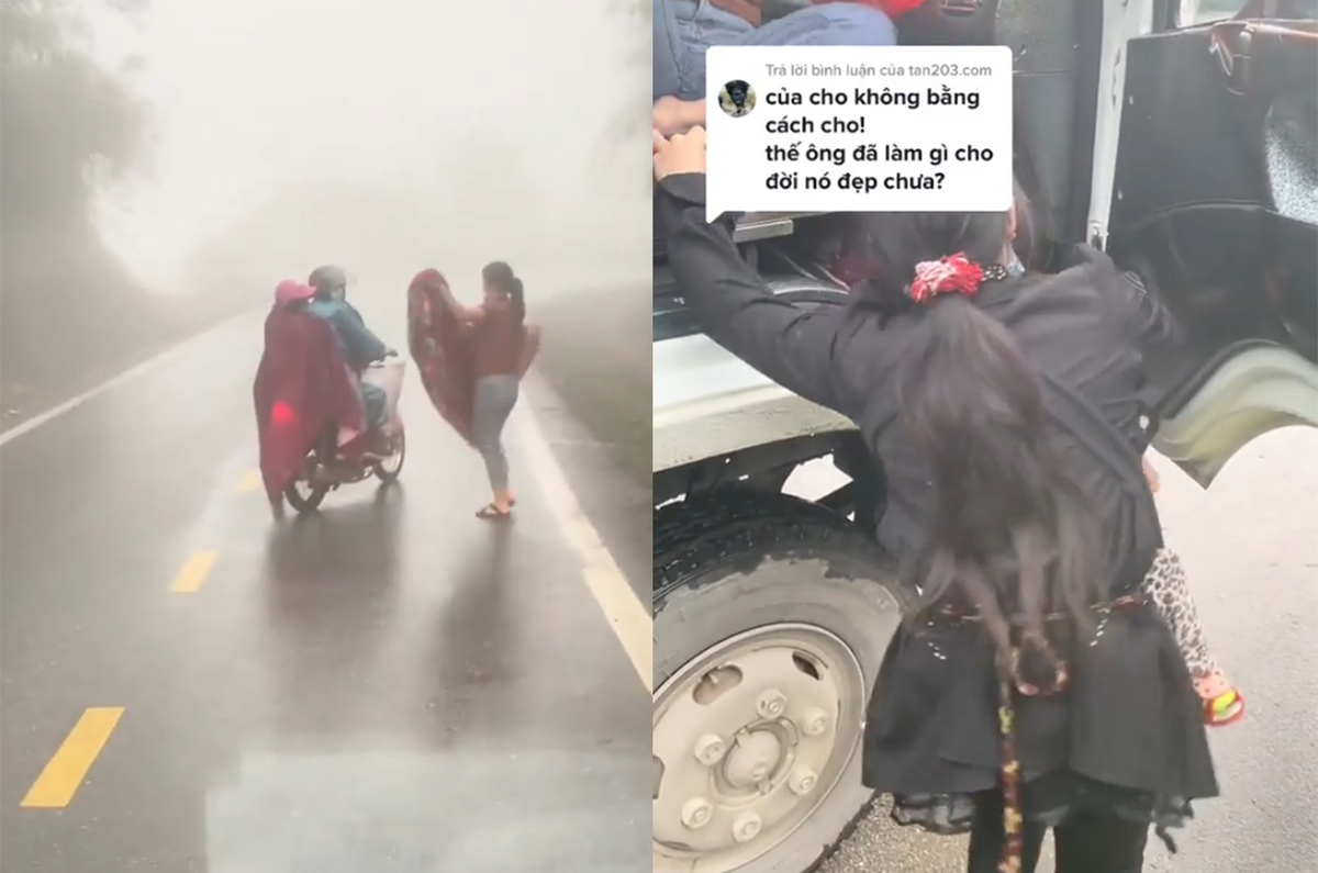 “Bác xe tải đi đèo thì gặp 2 vợ chồng cùng 1 cháu nhỏ đang trên đường từ Hải Dương về Hà Giang. Trời mưa rét buốt, lạnh giá nhưng cháu nhỏ chỉ nấp trong lòng mẹ sau lớp áo mưa.