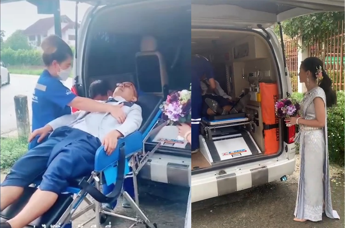 Chú rể đến dự hôn lễ của mình trên xe cứu thương.