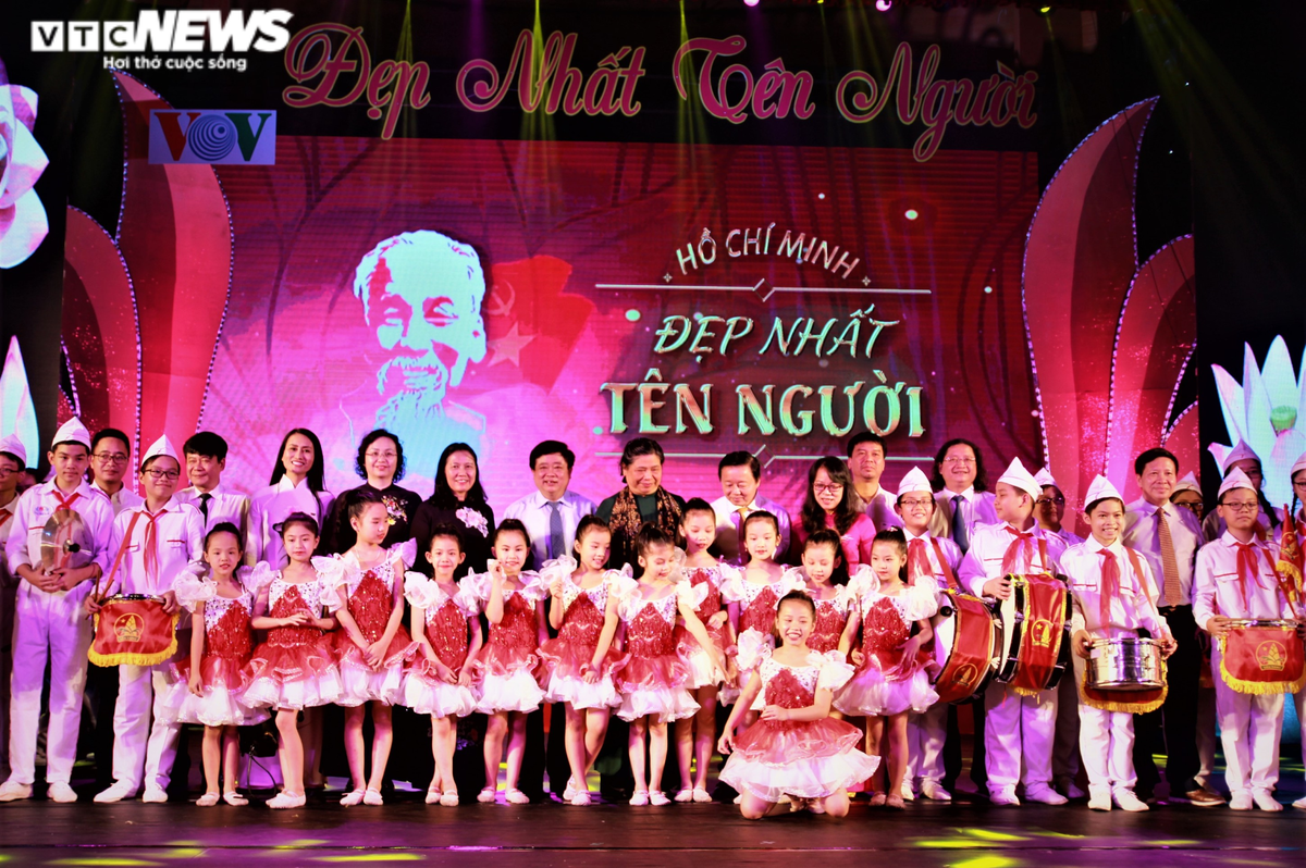 Các vị đại biểu và quan khách chụp ảnh lưu niệm tại chương trình nghệ thuật "Đẹp nhất tên Người". (Ảnh: Minh Tuấn)