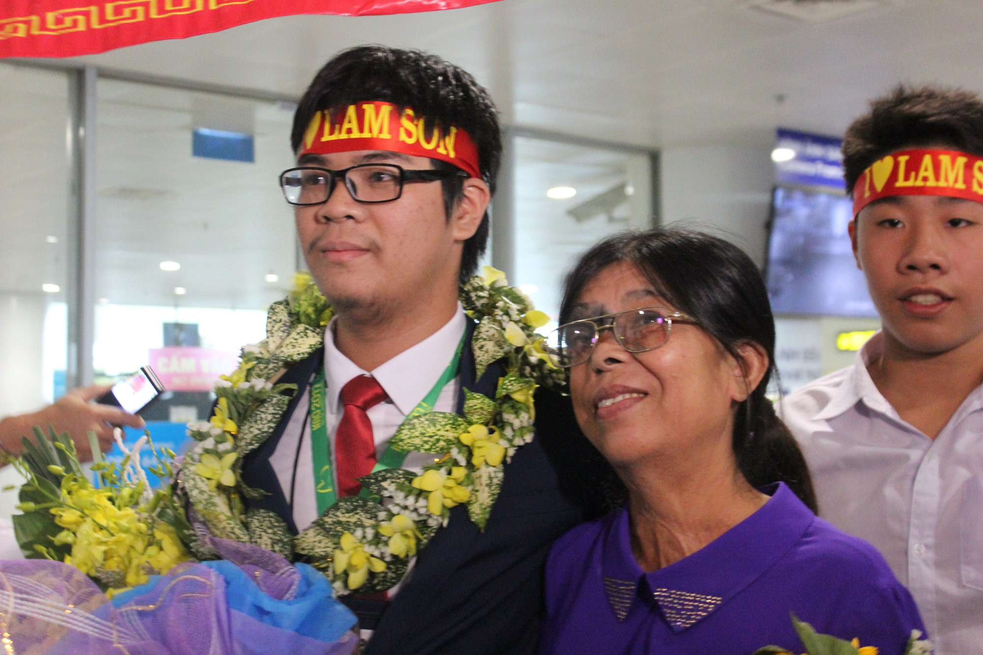 Trong số những phụ huynh đi đón con sáng nay, bà Nguyễn Thị Nam (phụ huynh em Lê Quang Dũng học sinh lớp 12, trường THPT chuyên Lam Sơn - Thanh Hóa) đã gây xúc động với hình ảnh người mẹ mang khiếm khuyết trên mặt rạng rỡ ôm bó hoa trên tay đứng chờ tặng con. Bà Nam muốn tận tay mình tặng con trai bó hoa khi vừa đáp xuống sân bay.