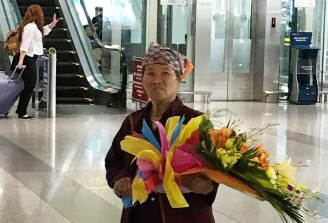 Người phụ nữ lớn tuổi cầm bó hoa đón con ở sân bay Nội Bài. (Ảnh: Facebook Lê Thái Tổ)