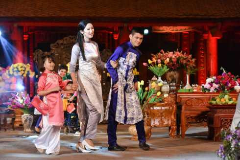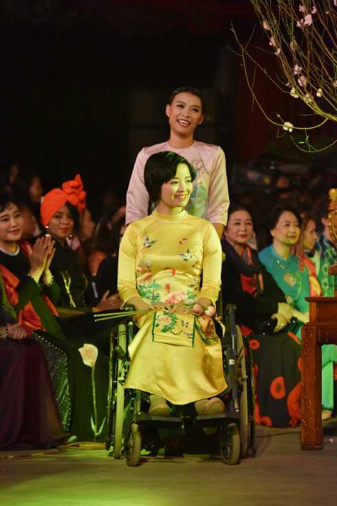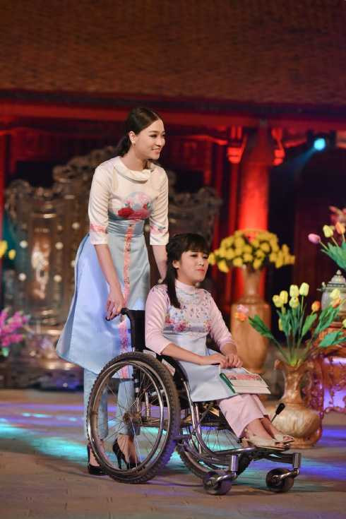 Đặc biệt, trong BST áo dài Hoa phù dung của Ngọc Hân, Hoa hậu đã trình diễn cùng người khuyết tật gây xúc động mạnh.