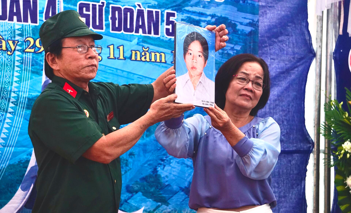 Chị gái liệt sỹ Lê Minh Nhật xúc động khi được một cựu binh trao di ảnh phục chế của em trai.