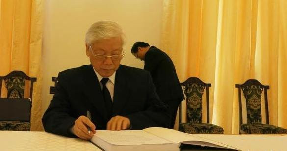 Tổng Bí thư Nguyễn Phú Trọng viết Sổ tang. (Ảnh: Tuổi trẻ).