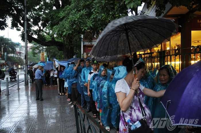 Trời mưa lớn, nhưng không ai rời vị trí xếp hàng, tất cả lặng lẽ lấy những chiếc áo mưa được chuẩn bị sẵn, hòa mình vào dòng người ngày một dài thêm trên con phố Ngọc Hà, chờ đợi giây phút được vào viếng Người.