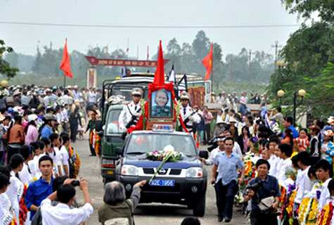 | Đoàn xe tang tiễn đưa mẹ Thứ về nơi yên nghỉ kéo dài hàng cây số |