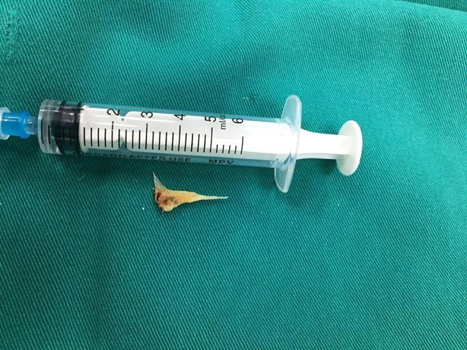 Sáng 1/3, bác sĩ Nguyễn Văn Phong - Trưởng khoa Tai Mũi Họng - đã tiến hành nội soi thanh khí phế quản trực tiếp, dưới gây mê để gắp dị vật. Mảnh xương cá 2 cạnh sắc nhọn, dài 3 cm đã được lấy ra khỏi khí quản bệnh nhân.