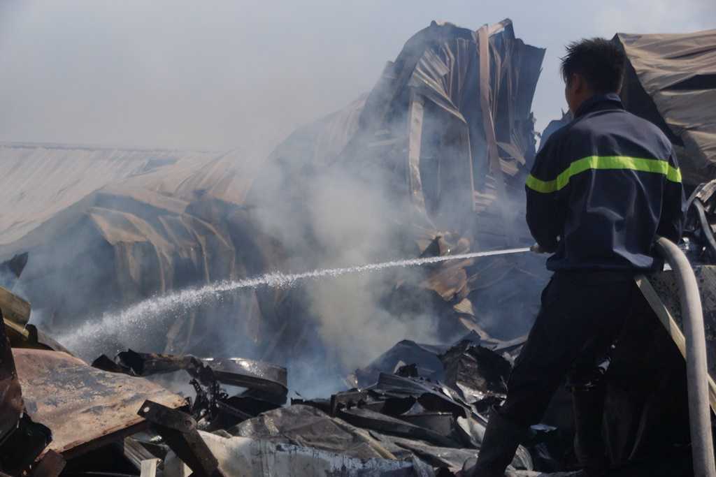 Sau hơn 5 giờ bùng cháy, đám cháy đã làm thiêu rụi nhiều nguyên vật liệu bên trong xưởng rộng 1000m 2. Mái tôn, tường nhà đổ sập.