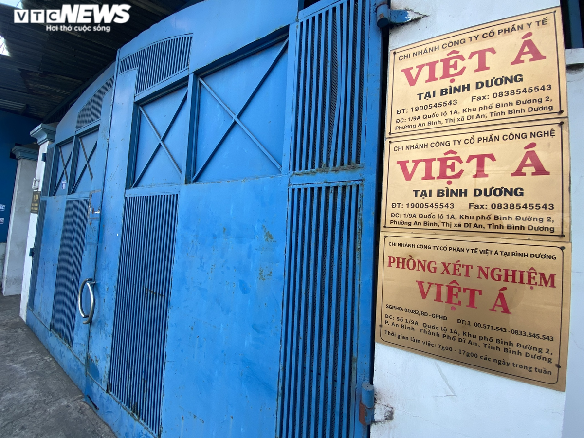 Phía ngoài cổng của xưởng sản xuất này được gắn 3 tấm bảng ghi: "Chi nhánh Công ty cổ phần y tế Việt Á tại Bình Dương" và "Chi nhánh Công ty cổ phần y tế Việt Á tại Bình Dương - Phòng xét nghiệm Việt Á".