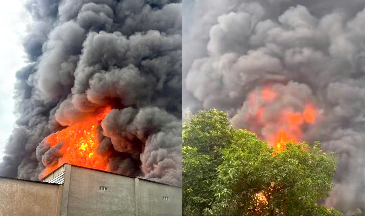 Theo người dân sống gần hiện trường, ngọn lửa bốc lên từ bên trong khu vực nhà xưởng, sau đó nhanh chóng lan rộng ra xung quanh rồi toả cột khói lửa cao hàng trăm mét.