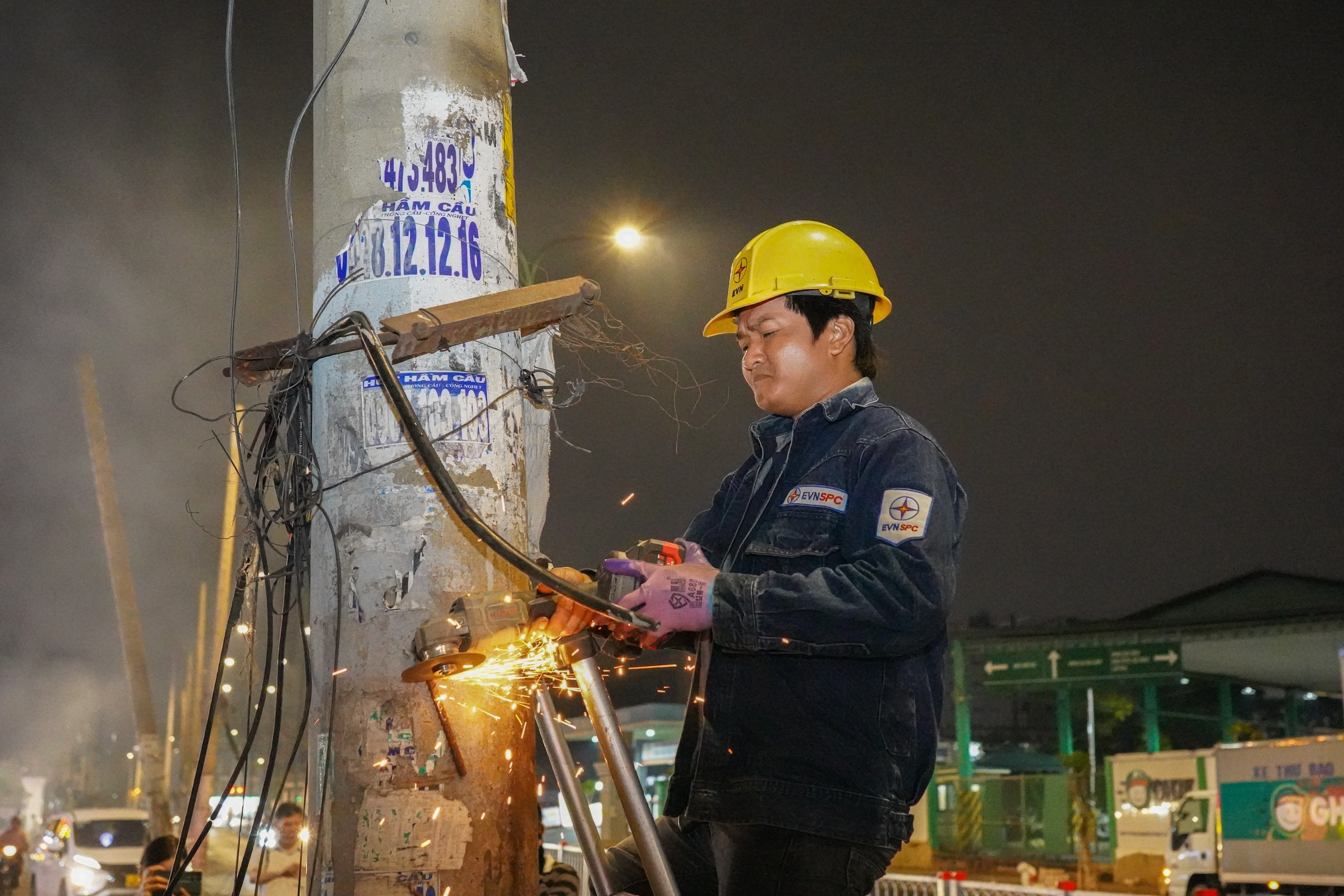 Theo ghi nhận tại hiện trường, công tác thu hồi và di dời trụ điện được thực hiện khẩn trương trong đêm bởi các nhân viên thuộc Tổng Công ty Điện lực TP.HCM.