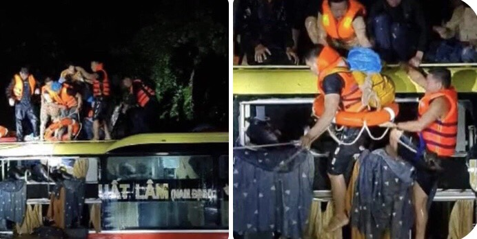 Ông Nguyễn Văn Thủy - Phó Chủ tịch UBND huyện Bố Trạch (Quảng Bình) cho biết, lực lượng chức năng của huyện vừa cứu hộ thành công 18 người mắc kẹt trên một chiếc xe khách bị nước lũ cuốn trôi.