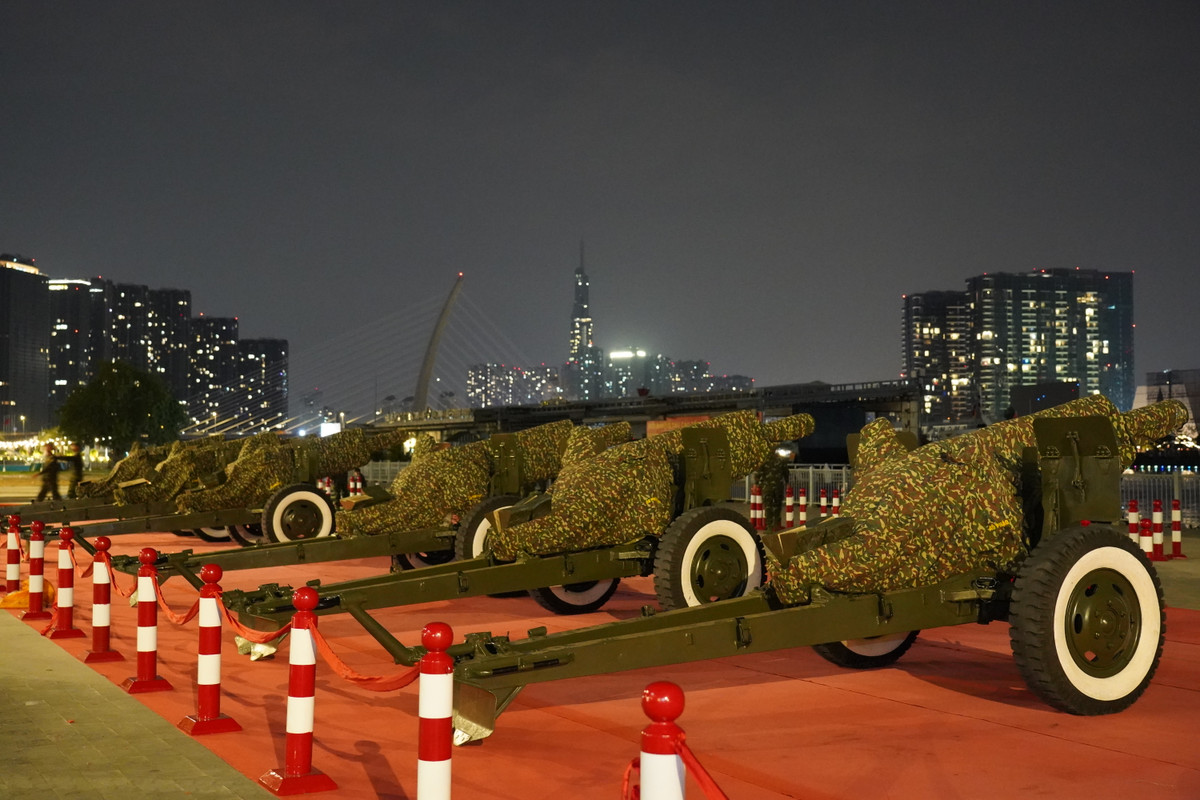 Để tạo nên không khí trang trọng cho sự kiện đặc biệt này, 15 khẩu pháo được đặt ngay ngắn trên nền thảm đỏ, dọc theo bờ sông Sài Gòn tại khu vực Bến Bạch Đằng. Việc sử dụng thảm đỏ không chỉ góp phần tăng tính thẩm mỹ mà còn thể hiện sự trang nghiêm, tôn vinh ý nghĩa lịch sử của lễ kỷ niệm 50 năm Ngày Giải phóng miền Nam, thống nhất đất nước.
