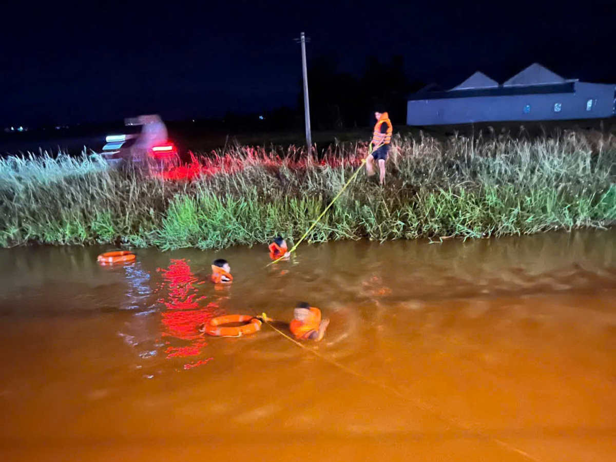 Lực lượng chức năng xuyên đêm tìm kiếm nạn nhân rơi xuống mương nước.