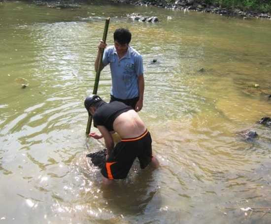 Để mọi người ngồi nghỉ tập trung tại một điểm, anh Thiên đi thăm dò và kiếm vị trí để đặt bẫy. Sau chừng 15 phút, anh quay lại và đưa nhóm chúng tôi đến con suối nhỏ có nước trong veo, bên dưới lòng sông toàn đá tảng bám đầy rong rêu. Hai bên bờ suối là cây cối um tùm.