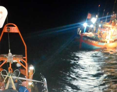 Sau nhiều giờ nỗ lực, đến 2h30 tàu SAR 274 lai dắt và đưa ngư dân bị nạn về Đà Nẵng.