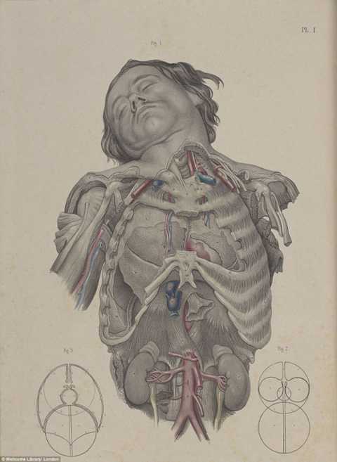 Sơ đồ trong cuốn sách năm 1856 cho thấy các bác sỹ mổ xẻ ngực, để lộ các mạch máu phổi, tim.
